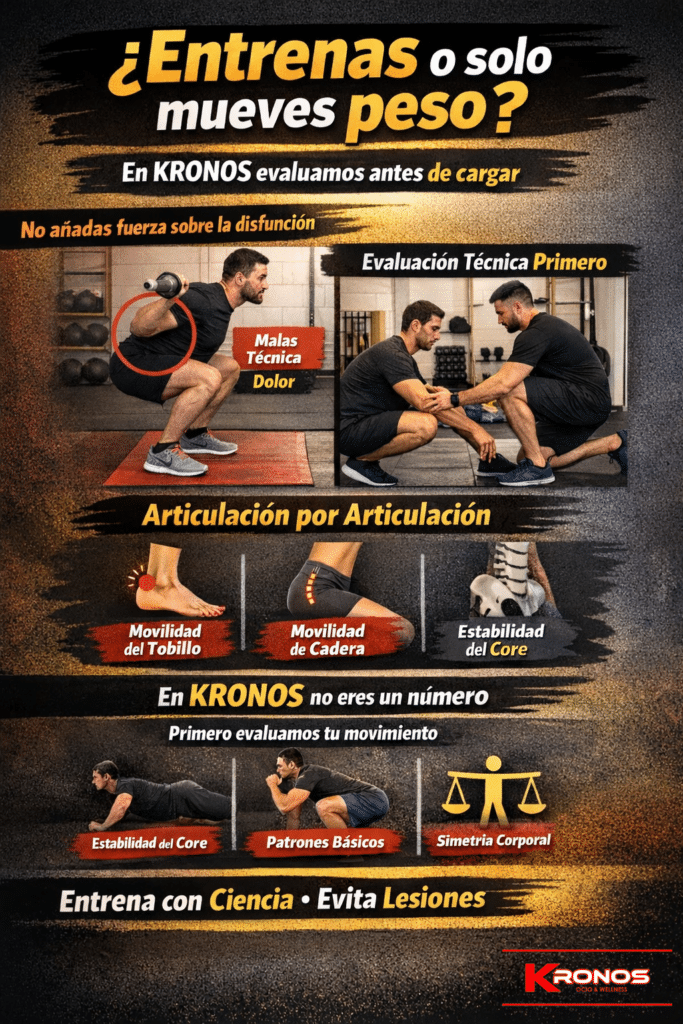 Por eso, en Kronos, antes de dejarte tocar una barra, realizamos una evaluación técnica. No lo hacemos para frenarte, sino para asegurar que tu progreso sea imparable.